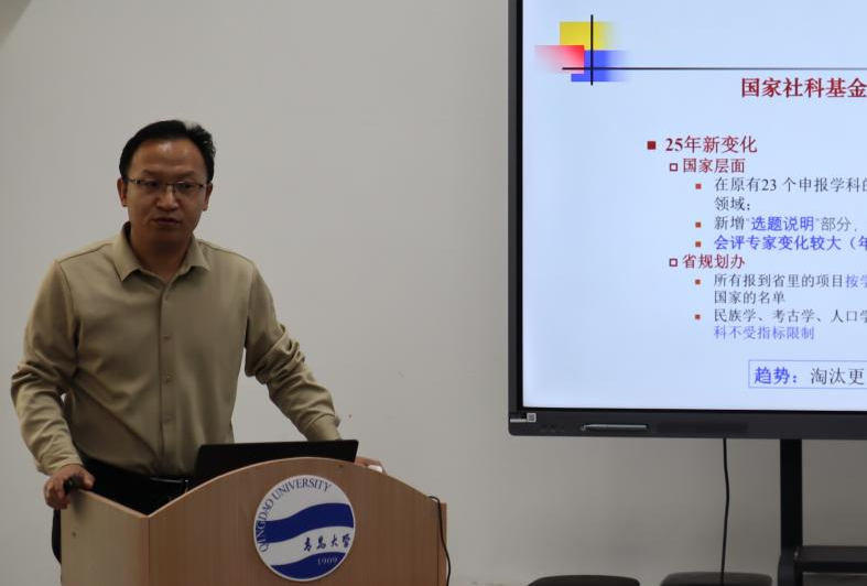 外语学院霍耀林教授以“书似青山常乱叠:国家社科基金项目申报思考”为题做了国社科基金申报讲座。讲座分析了2022年至2025年国家社科基金年度项目立项情况,从项目申报和评审的视角出发,总结了申报书中存在的共性问题;强调选题应突出问题意识,同时兼顾研究的可行性。他鼓励老师们抓住每一次申报机会,不断打磨,坚信“千锤百炼始成钢”。