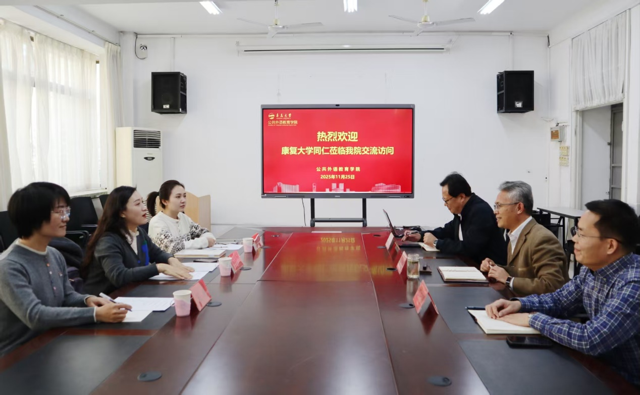 的热情接待表示感谢。她介绍了康复大学外语教学的学科特色以及当前在师资发展、课程改革、资源建设等方面面临的挑战。双方围绕外语学科建设、人才培养与教学改革等议题开展了深入讨论,并希望以此次交流为契机,进一步推动两校未来在大学英语教学等方面的深度合作。