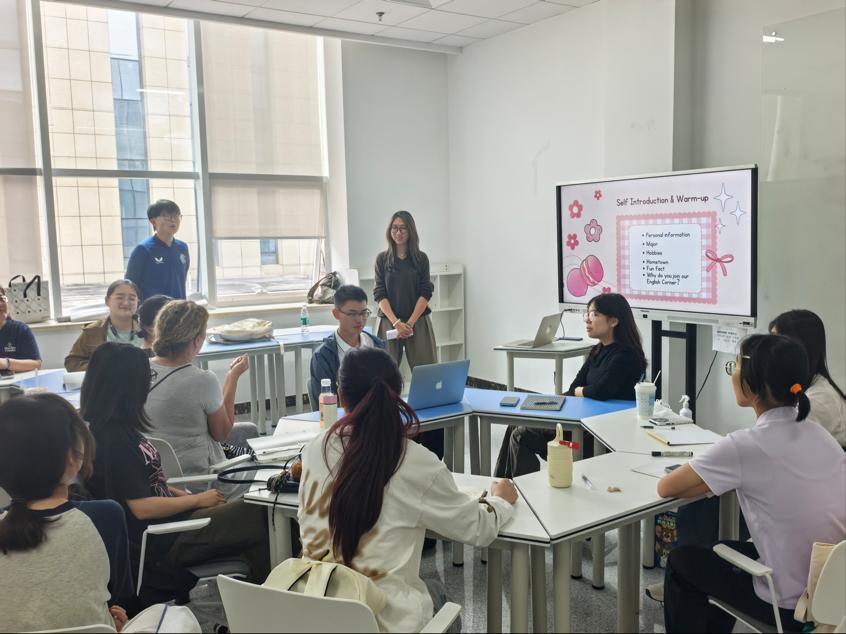 英语服务志愿者协会会长李一林主持。主持人请大家以简单的自我介绍进行热场,拉开了此次沙龙的序幕。同学们依次向大家介绍自己。现场欢声笑语,活动氛围轻松愉快,拉近了彼此的距离。
