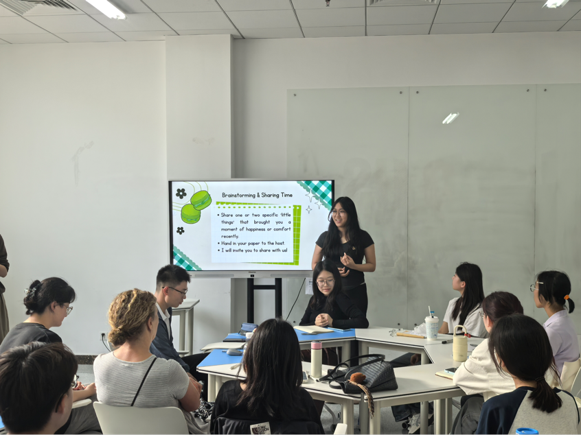 接下来的幸福瞬间分享环节更是点燃了在场同学们的热情,大家纷纷写下自己的幸福瞬间,外籍教师Diane和很多同学受邀上台分享了近期使自己开心的瞬间——旅途趣事、好友相聚、美丽的花束、期待已久的演唱会等等,愉悦的心情在教室里流动,开心的瞬间带给大家欢乐。